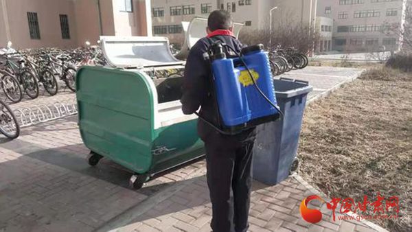 数九寒天,抗击疫情。西北师大的校园里,20多位工作人员身背消毒器,时不时对 “口罩桶”进行消毒处理,这是学校设立的20多个“专用”垃圾桶,用来收集一次性废弃口罩。