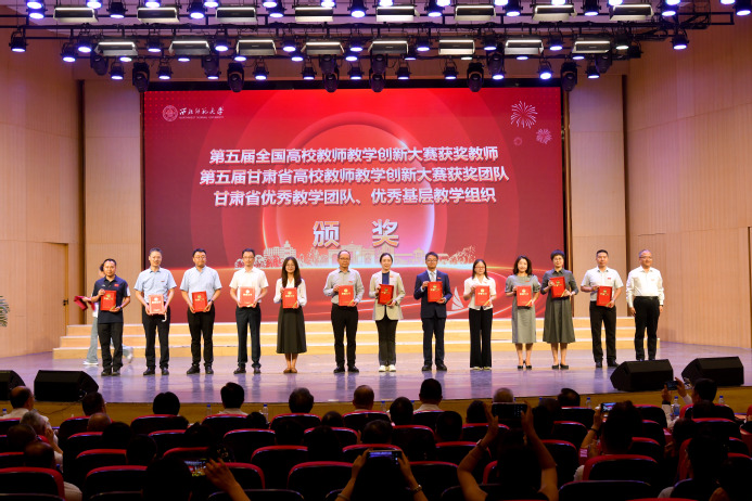张明军为第五届全国高校教师教学创新大赛新文科正高组一等奖获得者,第五届甘肃省高校教师教学创新大赛获奖团队、甘肃省优秀教学团队、优秀基层教学组织获奖代表颁奖。