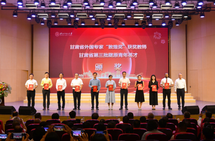 王占仁为从教30年教师代表颁发纪念牌,为2024年度国家级高层次人才代表颁发聘书,为甘肃省外国专家“敦煌奖”获得者、甘肃省第三批陇原青年英才人才代表颁奖。