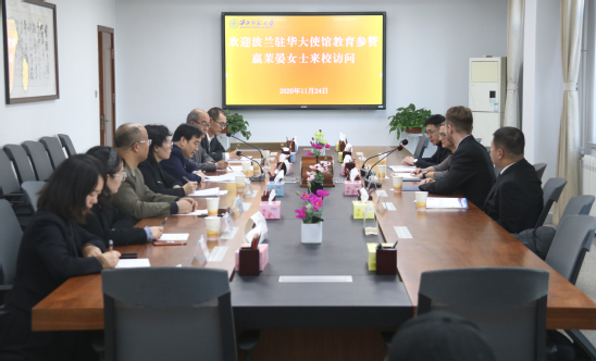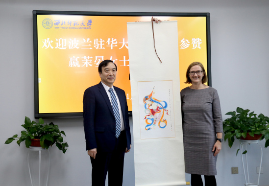 田澍对嬴茉晏女士一行来访表示诚挚欢迎,介绍了甘肃的基本情况、学校办学特色和国际交流情况。他说,近年来,学校努力提升与“一带一路”沿线国家高校的合作交流和人员往来,重视和加强与中东欧国家间的合作交流,特别是与波兰的合作日益紧密。今年9月,学校同波兰波兹南艺术大学合作举办的环境设计专业中外合作办学项目首批47名学生已入校学习;10月,聘请波兹南密兹凯维奇大学6名教授为西北师大化学和物理专业研究生外籍兼职合作导师。田澍希望通过此次来访,进一步密切学校和波兰高校合作关系,共同推进“一带一路”建设,践行人类命运共同体理念。
