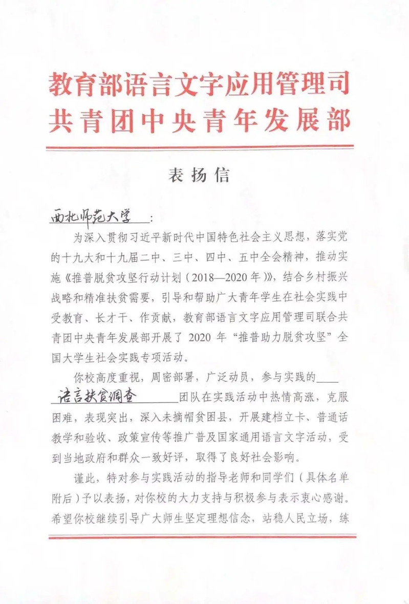 近日,教育部语言文字应用管理司、共青团中央青年发展部向西北师大发来表扬信,感谢西北师大传媒学院语言扶贫调查实践团在2020年“推普脱贫攻坚”全国大学生暑期社会实践专项活动作出的贡献。这是传媒学院社会实践工作连续两年受到教育部、团中央来信表彰。