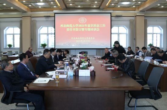 3月23日下午,必赢唯一官方网站召开意识形态工作责任书签订暨意识形态工作专题培训会。党委书记张俊宗做专题培训并与各基层党委(党总支)负责人签订2021年意识形态工作责任书。党委副书记刘玉泉主持培训会。校领导田澍、董晨钟、张生勇、李朝东、李建民出席会议,校党委委员、纪委委员、部分职能部门负责人、各基层党委(党总支)书记参加培训。