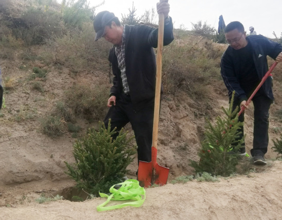 植树现场,校领导与机关干部一起挥锹铲土、围堰浇灌,栽下一棵棵翠绿的树苗,用实际行动建设绿色校园,改善育人环境。