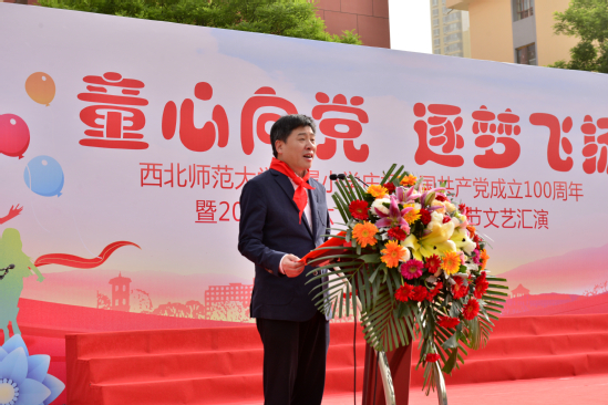张俊宗在致辞中指出,一百年来,中国共产党披荆斩棘、接续奋斗,带领中国进入了一个伟大的新时代,祖国的繁荣发展为孩子们的成长成才创造了良好的条件。与西北师大同行、与时代同行的附属小学,在西北师大高层次人才引进、青年教师队伍稳定等方面做出了重要贡献,为西北师大打前战、打基础,是西北师大坚实的大后方!学习成就少年志,奋力托举未来梦。少年儿童是未来的主力军和生力军,他深情嘱托孩子们珍惜今天良好的学习环境,珍爱今天的幸福生活,努力成长为德智体美劳全面发展的社会主义建设者和接班人。