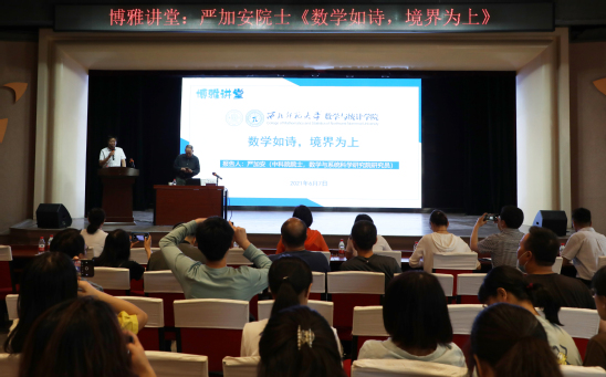 《数学如诗,境界为上》报告中,严加安从王国维的“境界说”出发讲述数学研究的境界,他认为评价一项数学成就的高低,应以境界为上,并详细讲述了数学与古典诗歌之间的境界相通性,进而提出数学的高境界:大道至简、大美天成;简洁美、和谐美、对称美、雅致美;创新;交叉、融合、统一。严加安还通过高境界数学的标准和实例、数学家的数学诗及他的创作心得阐述了境界在数学研究领域的重要性。