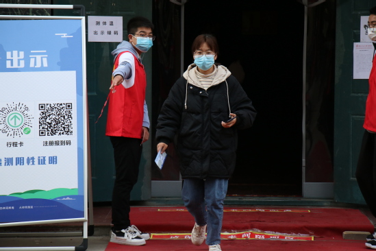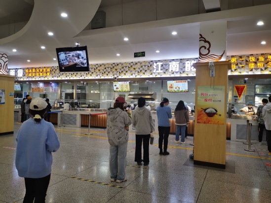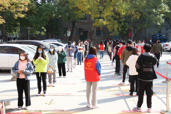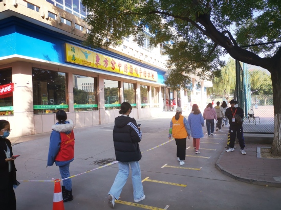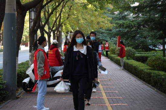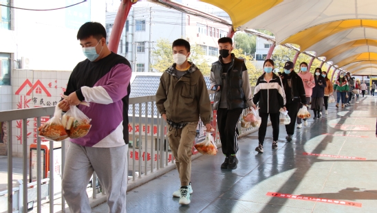 “每天早中晚‘干饭’时间,只要防护到位,手持通行证,就有相关志愿者引导从公寓东门出发,并在途中始终保持一米安全距离,直至取到餐品再次返回,整个过程井然有序,均有志愿者的参与引导。尽管比起平常要慢一下,但却切实维护了学生的健康安全,我们要为这一重大举措点赞。”文学院2021级学生张开砚说。